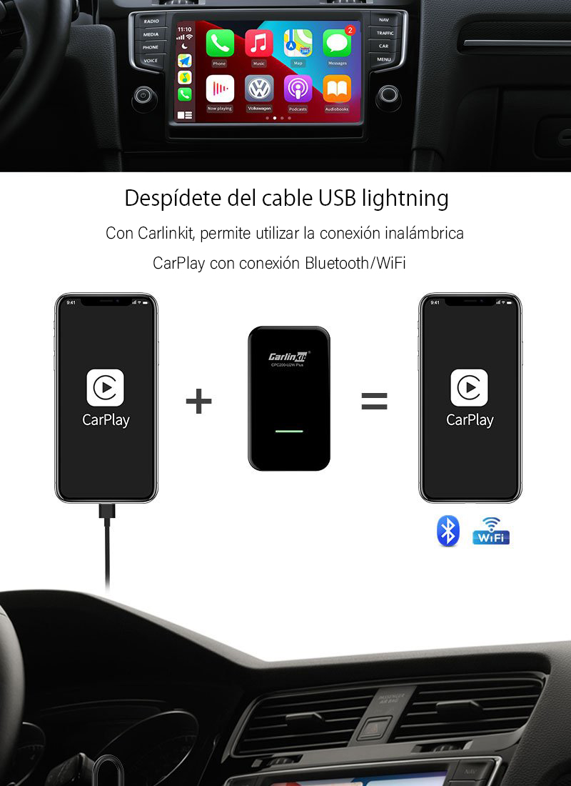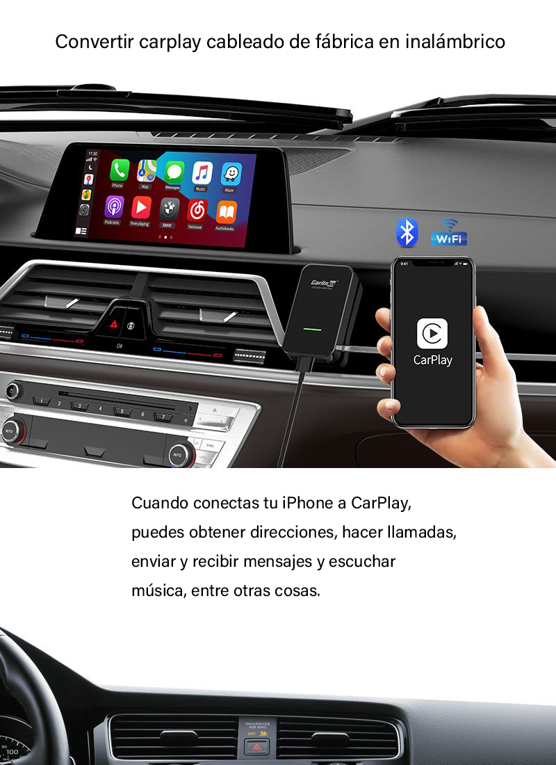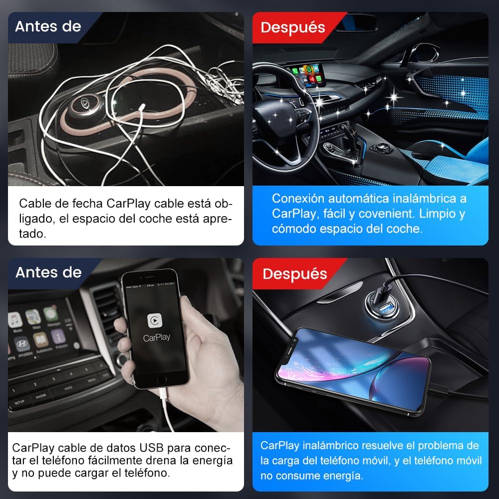 - Función Principal: Disfrute De La Conexión Automática E Inalámbrica A CarPlay Sin Necesidad De Un Cable USB. Eche Un Vistazo A Esta Sencilla Manera De Adaptar Su Sistema CarPlay Existente Para Convertirlo En Inalámbrico. CarPlay Inalámbrico Facilita La Reproducción De Música, La Navegación Por Voz De Google O El Uso De Siri ¡Sin Cables!